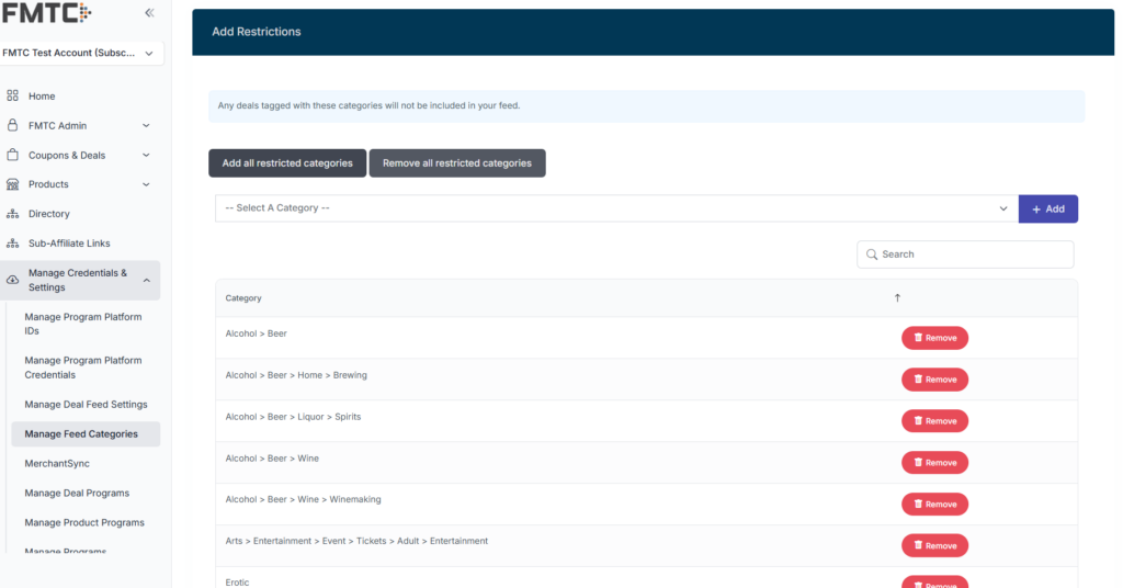 Note: These steps will override the FMTC default restricted categories, using the categories that you set up instead. You can still easily use FMTC’s default restricted categories by selecting the button “Add All Restricted Categories.” Once these categories have been configured, API calls made after will immediately reflect these changes and apply to the content you receive.