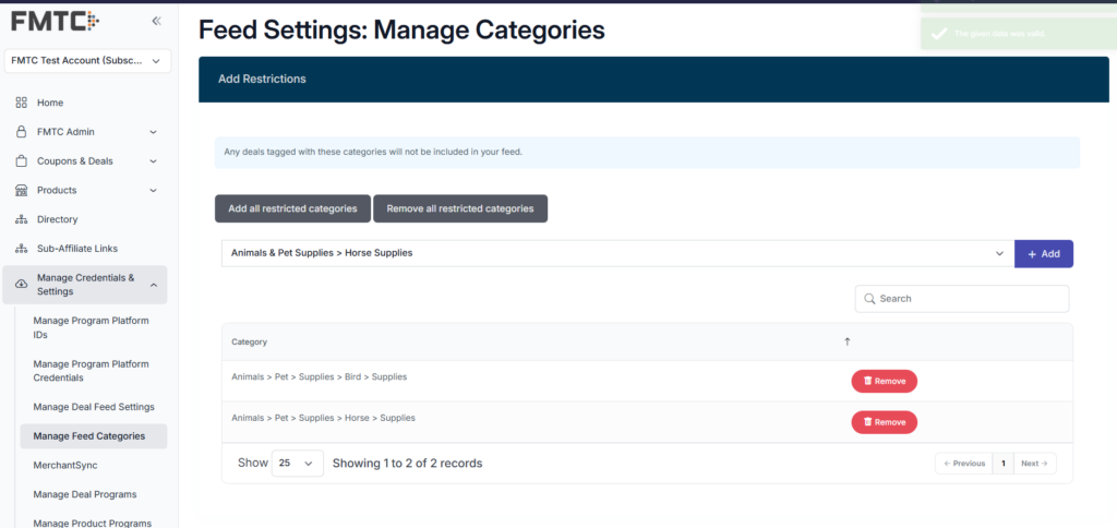 In this example, FMTC has four categories for Animals & Pet Supplies: bird, cat, dog, and horse. The setup below ensures you will only receive deals under Cat Supplies and Dog Supplies. The Bird and Horse Supplies categories have been restricted.